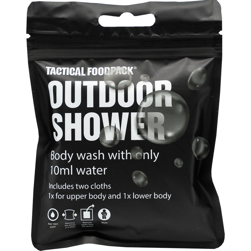 All you need is 10ml of water. Just add water in the pouch, squeeze couple of times and start your shower. In the package you will find 2 clothes, one for upper body and other for lower body. It doesn´t need rinsing. Your skin will be clean and moisturized. Tactical Foodpack is the best freeze-dried food for camping, hiking and outdoor adventures.